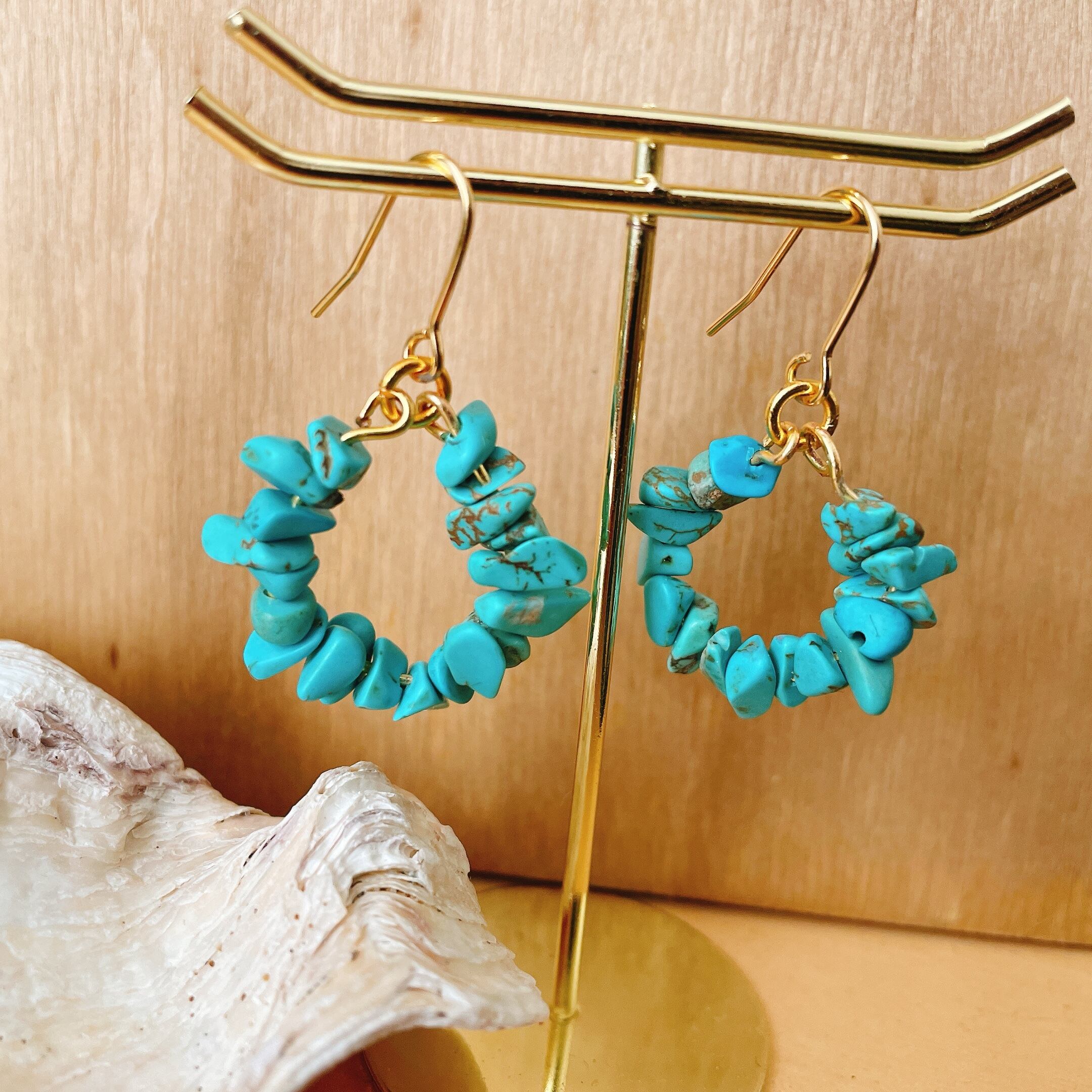 ターコイズビーズをたくさん使い、リースデザインに 大きさ 直径2〜2.5cm ビーズ1つ1つの大きさにバラつきがあるため完成サイズが前後します。 イヤリングへの変更不可